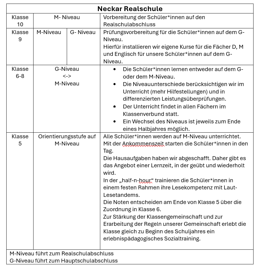 Durch das von uns erarbeitete Schulcurriculum, legt die NRS einen Lernschwerpunkt auf die Hauptfächer Deutsch Mathematik und Englisch. Auch die Stundenstruktur an der Neckar Realschule ist dadurch einzigartig. Bei uns arbeiten die Schüler*innen in 70 -minütigen Unterrichtsstunden, sogenannten Blöcken. Ein neuartiges Stundensystem, das viele Vorteile mit sich bringt. Zum einen sorgt dies dafür, dass die Schüler*innen am Vormittag in maximal vier verschiedene Fächern unterrichtet werden. So ist die Schultasche automatisch leichter und der Schulbetrieb deutlich ruhiger. Zum anderen haben die Schüler*innen effektiv mehr Unterricht in den Hauptfächern, wodurch die Kinder und Jugendlichen besser gefördert werden. Auch ermöglicht es unser Schulcurriculum eine Klassenratsstunde fest in die Unterrichtswoche zu integrieren.